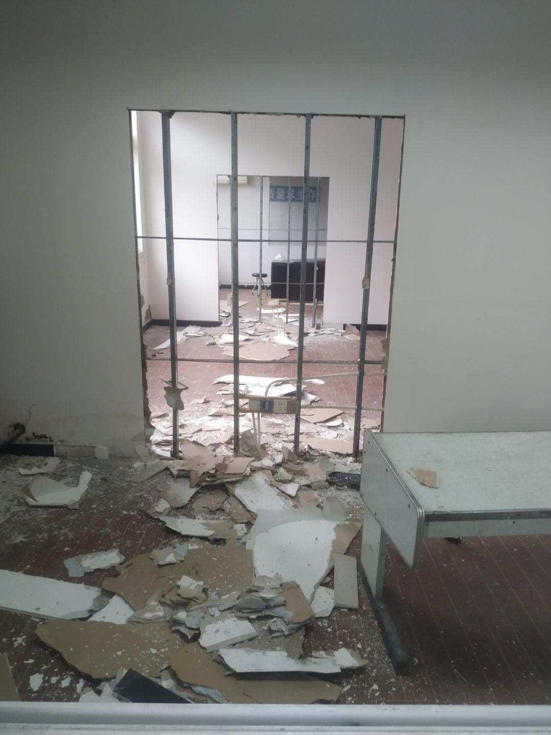 1.增项墙体拆除完成,窗帘盒安装完成。2.彩钢立板安装,门框料预制完成,门框安装完成50%,撕膜完成,打胶完成25%,塑料底座安装完成40%,圆弧安装完成20%。